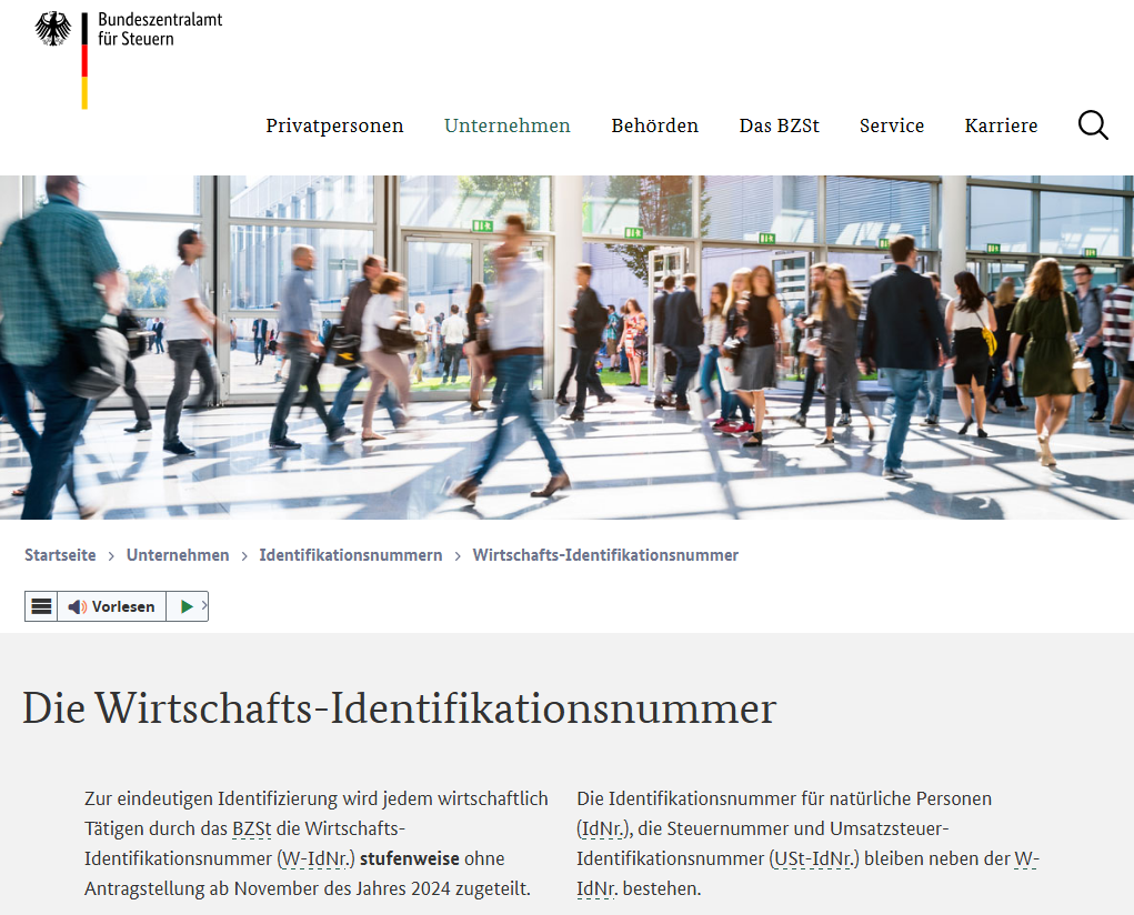 Die Wirtschafts-Idenfikationsnummer (W-IdNr.) wird ab November 2024 stufenweise automatisch vergeben. Sie erhalten diese ohne Antrag entweder im Wege der öffentlichen Mitteilung oder elektronisch über Ihr ELSTER Benutzerkonto.