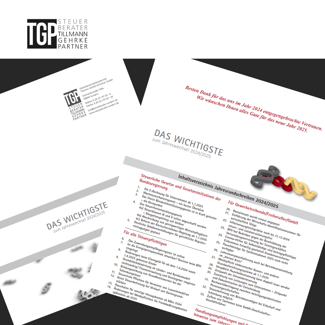 Neben den monatlichen Steuer-News, möchten wir Sie hier mit allen steuerrechtlich wichtigen Informationen für den Jahreswechsel 2024/2025 versorgen.